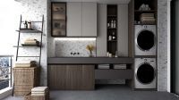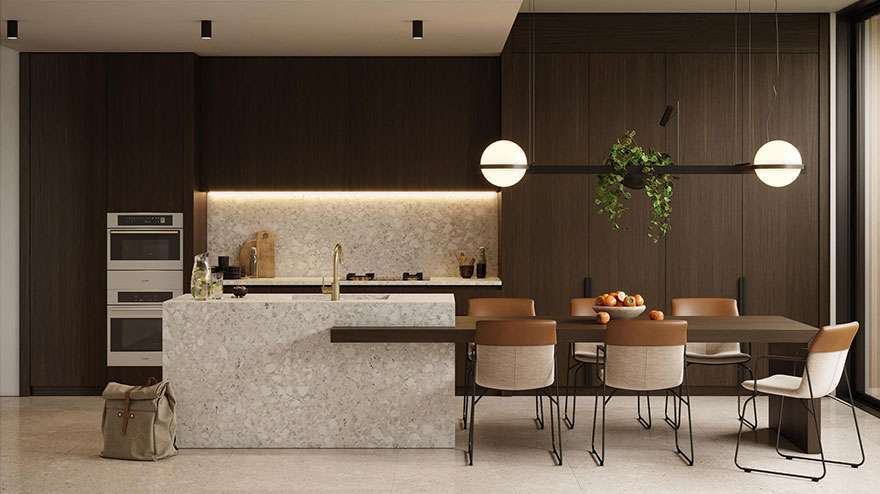 木飾面粗狂無拘束,有蓬勃大氣之感;與巖石紋的廚房背景及深灰色中島相搭既中和了狂野的氣質,又收斂至恰到好處的分寸內,讓人不經意為這空間的度量點贊。熠熠質感撲面而來;簡約的線條流暢清晰無阻礙,內嵌空間充裕而貼心,理性就藏在每一個收納空間處。
