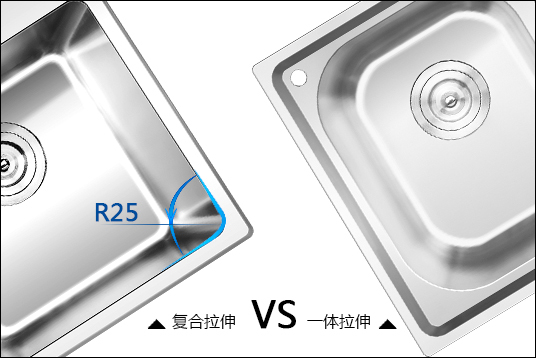 1、R角(槽體轉(zhuǎn)角)是水槽選購(gòu)的一個(gè)重要技術(shù)指標(biāo),R角越小,槽體使用空間就越大。行業(yè)慣例R角<25就稱為小R角。一體拉伸水槽由于工藝限制是很難做到小R角的。帕布洛復(fù)合拉伸水槽是R25,內(nèi)部使用空間更大。