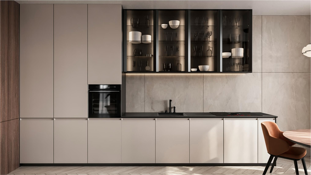 一字型櫥柜讓設(shè)計總是能讓空間產(chǎn)生更多的可能,黑白色的色彩搭配讓整個空間顯得干凈利落,暖調(diào)燈光為這套廚柜增添了奢華感,在這樣的環(huán)境隨時品嘗一杯也是一種生活情調(diào)。