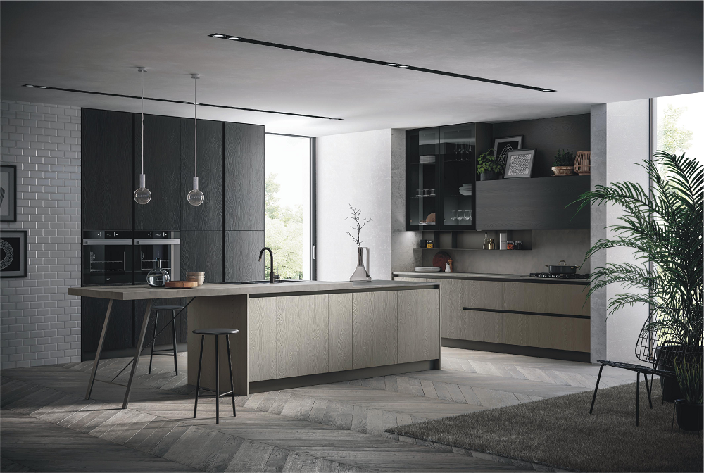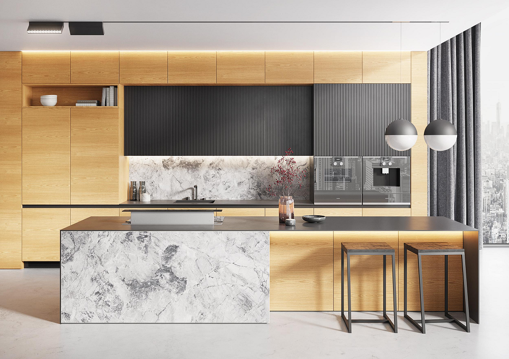 嚴(yán)謹(jǐn)、簡(jiǎn)約的設(shè)計(jì)在這個(gè)廚房里無限組合,折衷主義的色彩搭配呈現(xiàn)沉浸式視覺體驗(yàn),橡木色與深灰色柜體及米白色門板的完美結(jié)合,賦予藍(lán)爵Ⅰ系列不同的風(fēng)格,不銹鋼材質(zhì)的細(xì)膩表現(xiàn)完美詮釋了整個(gè)廚房的現(xiàn)代氛圍。